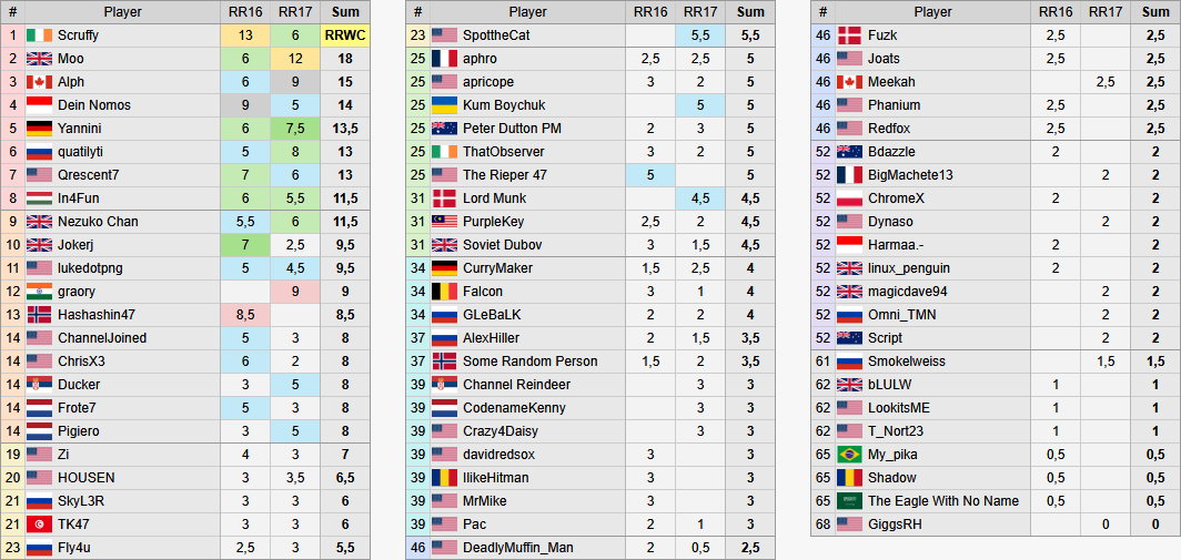 Note that the signup limit for RRWC 2025 is 64 players, determined by signup date, not seeding. In other words, the first 64 signups for the tournament will be guaranteed to participate, regardless of their seeding. In case of extraordinary interest, signups will also be accepted in the first 48 hours from the original announcement.